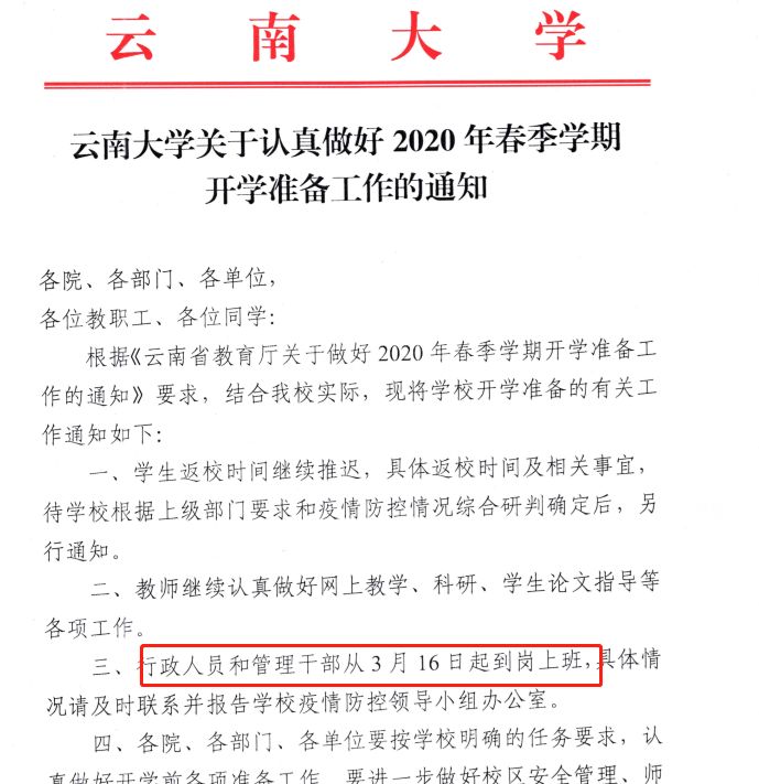 3月14日,云南大学官网发布了《云南大学关于认真做好2020年春季学期开学准备工作的通知》。