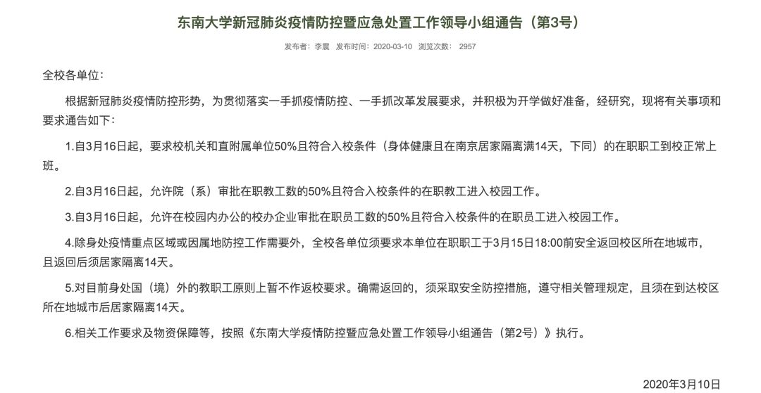 3月10日,东南大学官网发布了《东南大学新冠肺炎疫情防控暨应急处置工作领导小组通告(第3号)》。