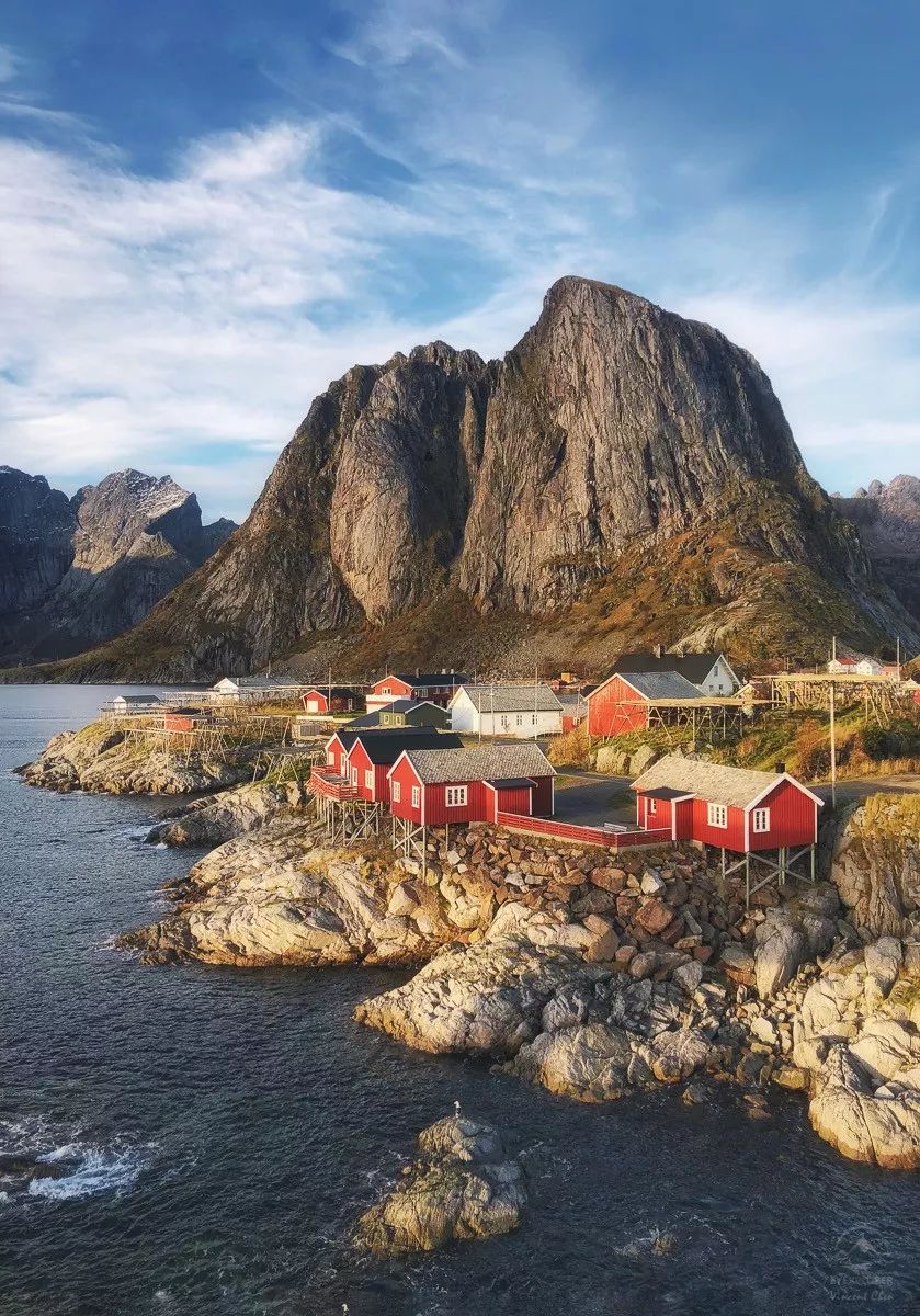 摄于挪威雷纳渔村,日落的柔和阳光洒在山峰和小岛上,精致的红色小房子成了最美的点缀。