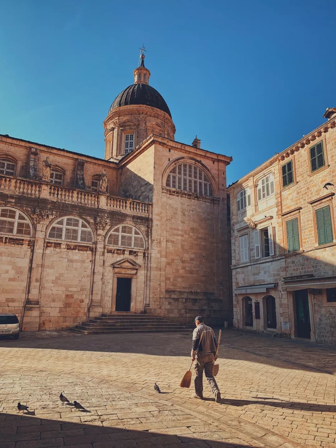 这是在君临城的清晨拍摄的一张作品,一位清洁工拿着扫帚从我面前走过,阳光洒在他的身上,鸽子在他身边觅食,这一切的一切都是这么的安静又美好,我随手从包里掏出手机,拍下了这一刻。