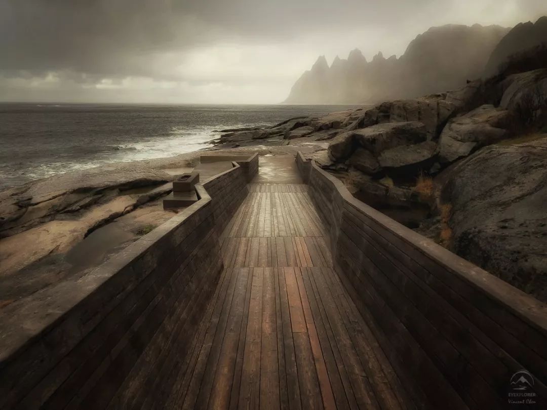 摄于挪威 Senja 的海滩,那天日落时刻天气不佳,阴雨朦胧,我沿着走廊到达海滩时,远处的峡湾若隐若现,配合现场的灰暗色调,别有一番意境。