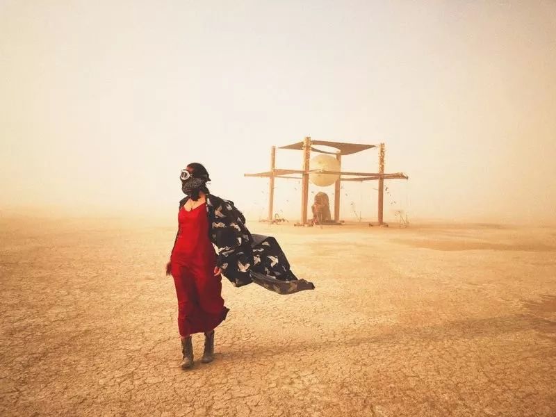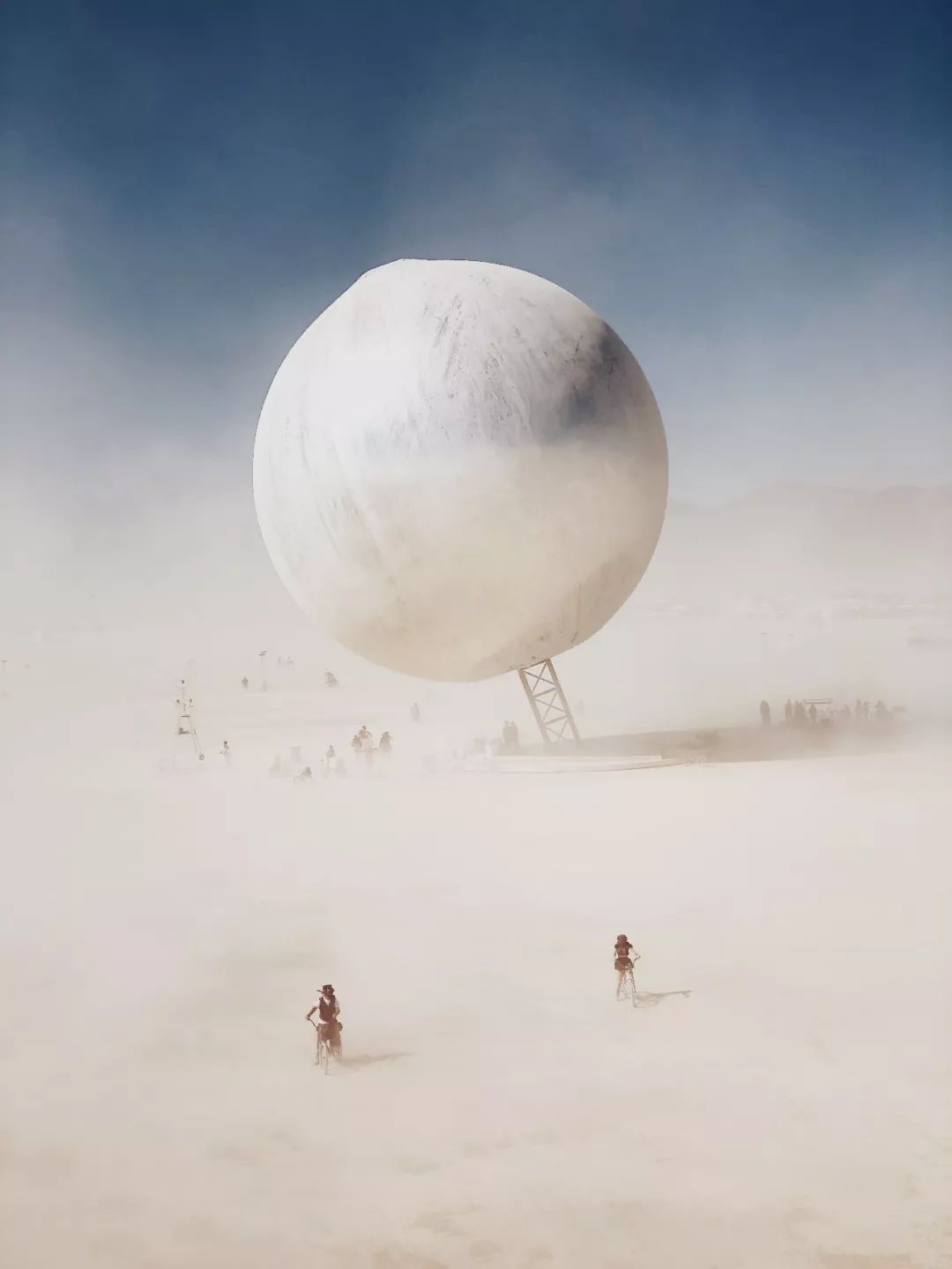 去年 8 月,我前往美国参加一个倡导自由与包容的节日,火人节。在这里一个临时城市从出现到拆除一共 7 天,我们带着现代人的意识形态回到社会最原始的状态,好像未来的人穿越时空来看当下的我们,而我每天沉迷于寻找沙漠中人们搭建的庞大装置艺术,在沙尘暴来临时被这些“艺术”所庇护。我在一座彩虹桥上看到两个人被困在了沙尘暴中,而风暴之后,他们和巨大的银球面面相窥,不知道是谁遇见了谁,我好像身处加西亚·马尔克斯式的魔幻现实主义中,从未感觉我们身处的世界是如此上不真实。于是我用手机拍下了这番景象。
