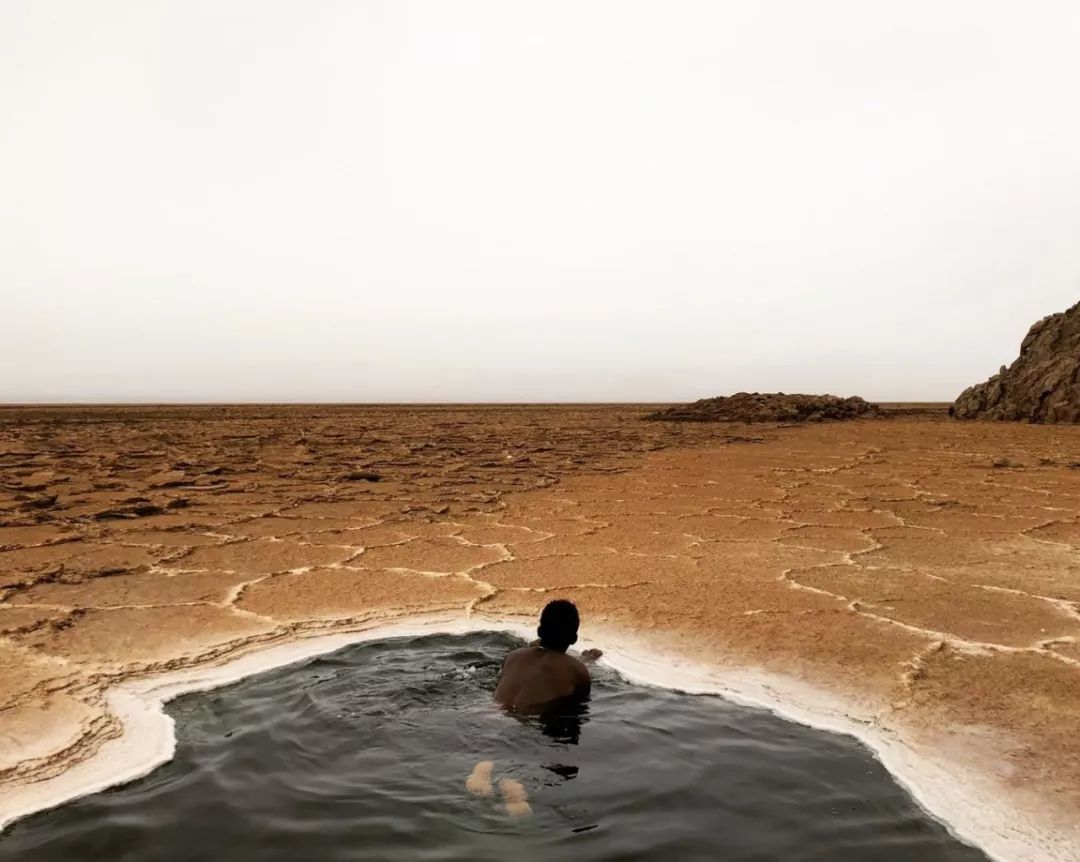 2018 年 7 月,埃塞俄比亚北部。一处盐矿具有相当特殊的地貌,散布在盐矿内有许多大小不一的水塘,一个当地人在一处小水塘内游泳,像极了一个私人泳池。