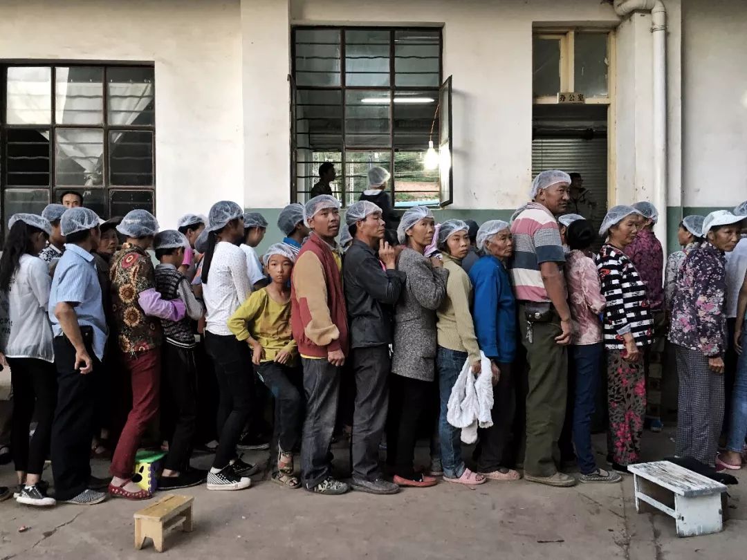 在云南山区一个小县城的手工作坊里,村民们有序排队等待领取手工,其中不乏放暑假的学生,黄发之年的老人,形态万千。