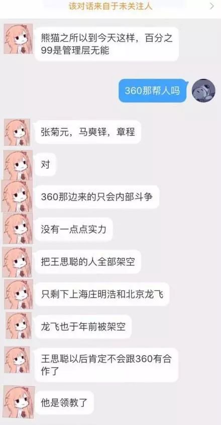 此外,还有传闻称,360 入股熊猫后,其派出的高管内斗,也是熊猫“死亡”的因素之一。