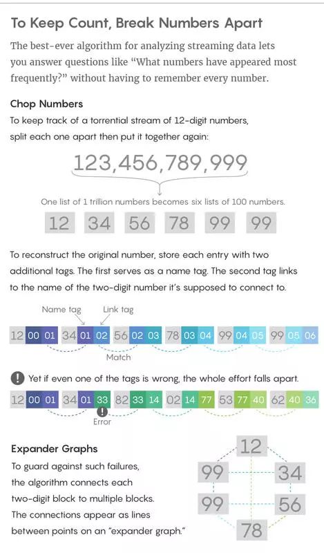 “这是一个编码问题——你把信息编码成紧凑的概要信息,而试图提取出信息来恢复最初放入的数据”,华威大学计算机科学家 Graham Cormode 说道。