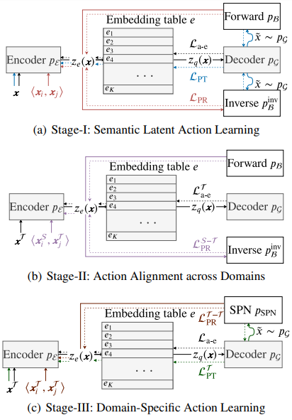 MALA 三段式整体框架,即语义隐动作学习、跨域动作对齐和特定域动作学习。