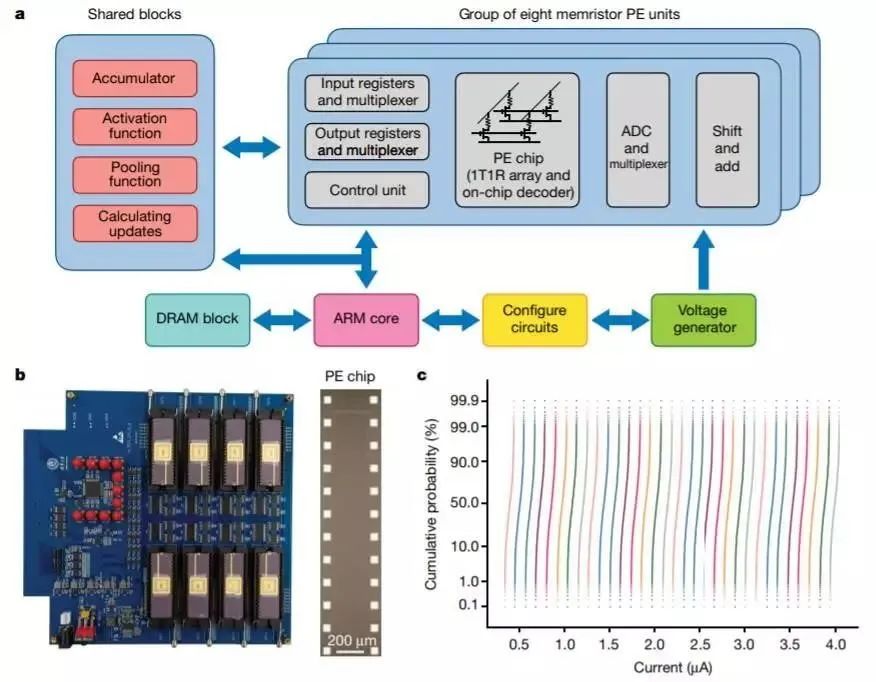 ,该实现共集成了 8 个包含 2048 个单元的忆阻器阵列,以提升并行计算效率。此外,研究者还提出了一种高效的混合训练方法,以适应设备缺陷,改进整个系统的性能。研究者构建了基于忆阻器的五层 CNN 来执行 MNIST 图像识别任务,识别准确率超过 96%。