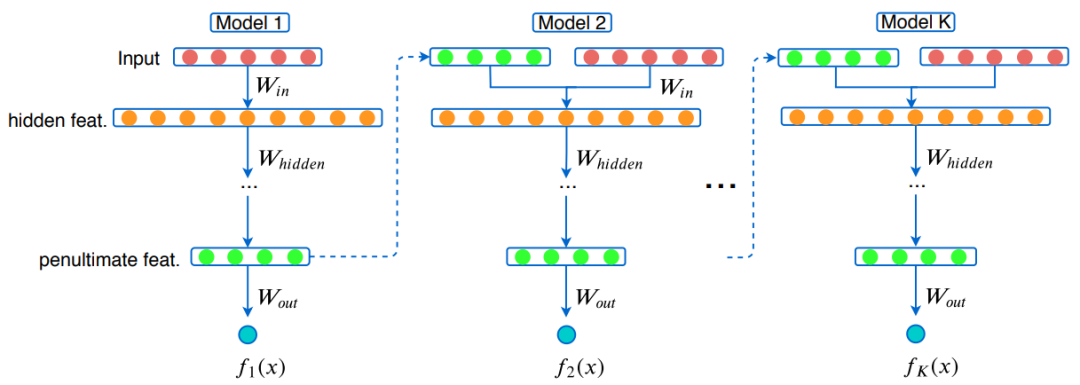 本文提出的 GrowNet 架构图。在第一个弱学习器之后,根据原始输入的组合特征和前一个弱学习器倒数第二层的特征来训练每个预测器。