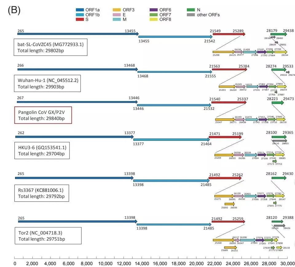 2019-nCoV 与广东穿山甲冠状病毒在受体结合域上表现出了非常高的序列相似性,尽管它的其余部分与蝙蝠冠状病毒 RaTG13 在病毒基因组方面的关系最为密切。