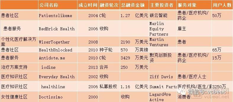 PatientsLikeMe的主要针对慢病病人建立网络社区。截至2017年1月,它已经拥有超过50万的患者,涵盖的疾病超过2700种。患者在PatientsLikeMe中互相分享治疗经验,社区中也拥有专业的医疗人士。