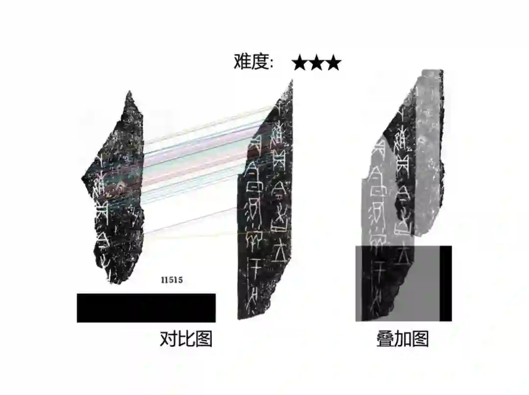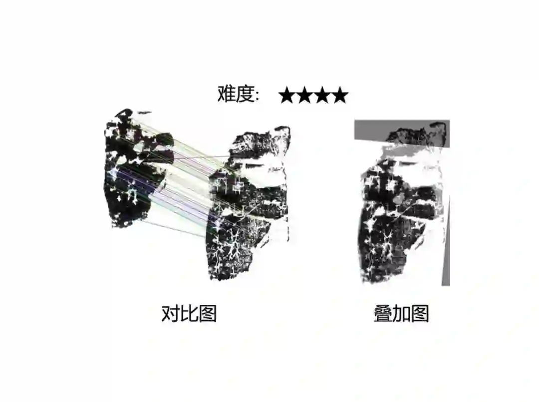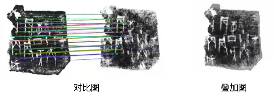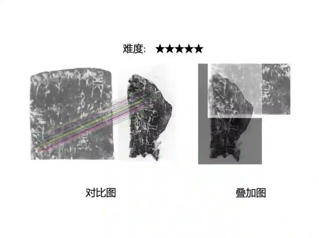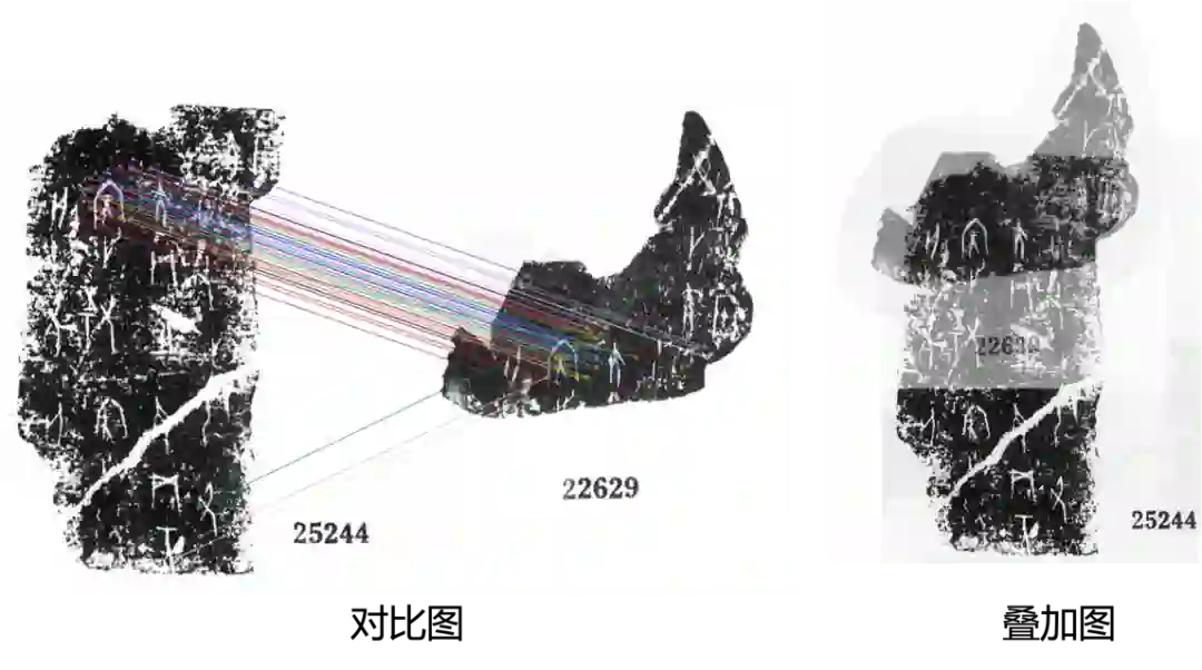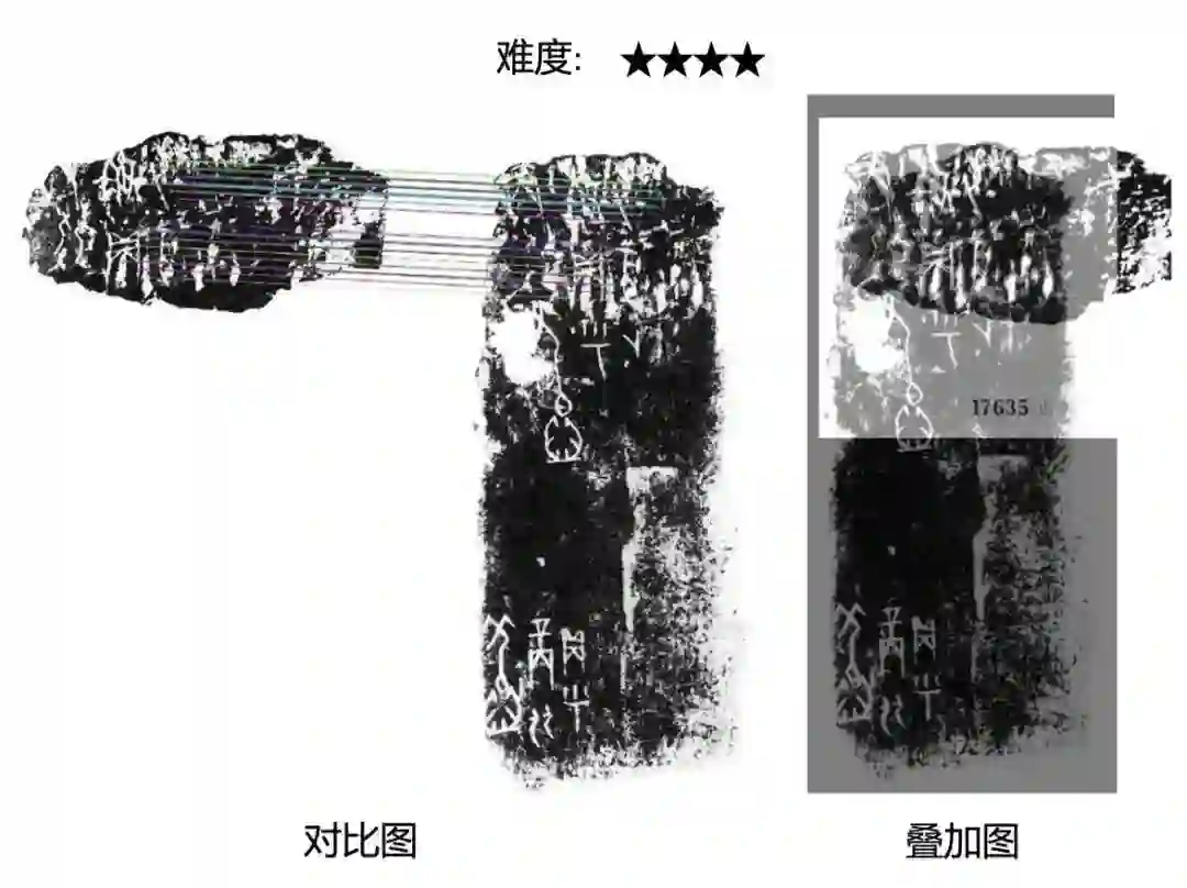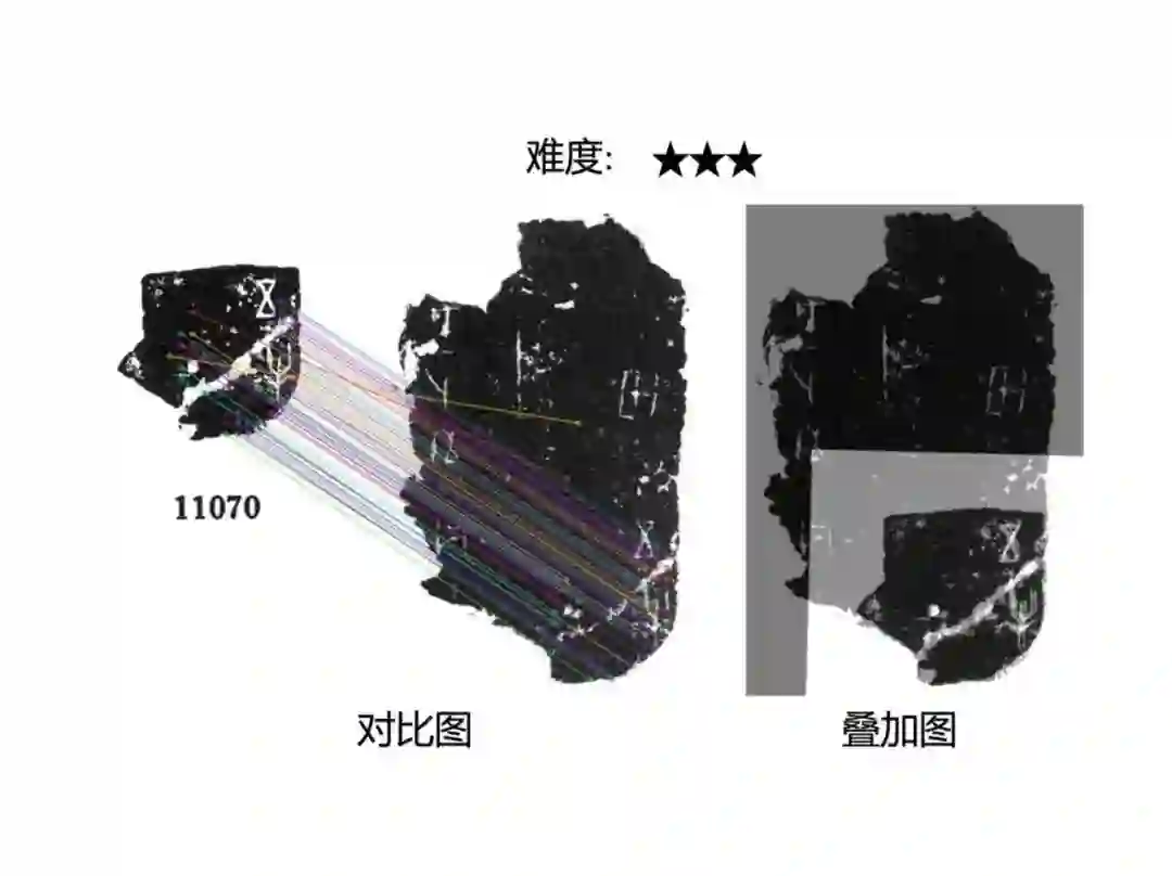 Diviner 模型另一个特点在于能够精确的预测出重片之间点对点的对应关系,并将重片拼合或拼接在一起。这种可以被专家快速解读的结果大大方便了人类与人工智能的协同合作。对于甲骨文这样的冷门绝学,人机合作尤为重要。在校重结果中,专家可以看到局部匹配细节和重叠图,极大地帮助并加速了他们验证的过程。