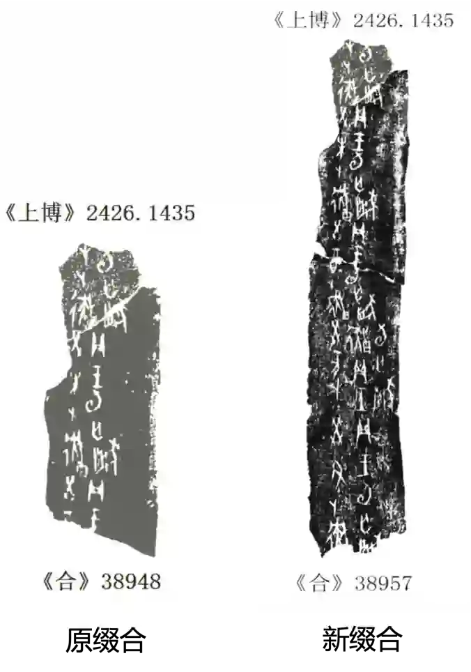 从“重片”到“缀合”。左侧图像是过去由张宇卫先生缀合在一起的两片甲骨。通过 Diviner 的校重发现,下部拓本原来还有一片更完整的重片。如此,两片甲骨的缀合就扩展成了三片甲骨的缀合。