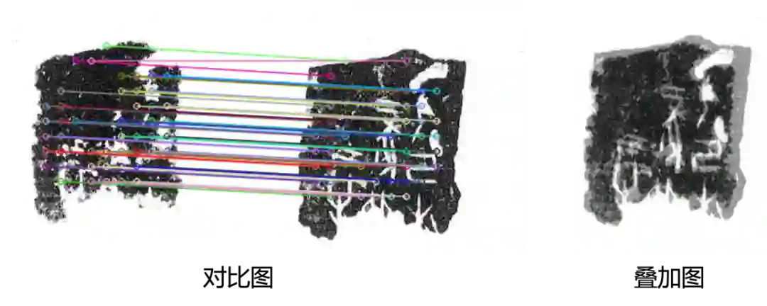 全局优化。基于密集的点与点的匹配结果,通过使用鲁棒的优化算法 RANSAC 估计全局的几何仿射变换。仿射变换允许模型在内容重复的情况下拼合或拼接已有图像。这种局部到全局的方法对检测大量的甲骨碎片至关重要。