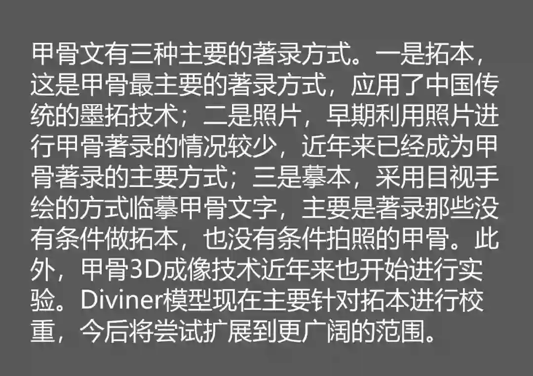 “过去的甲骨校重工作中,对拓面差异较大的不同拓本之间的认同存在现实困难。甲骨文校重助手 Diviner,既不受文字信息的限制,也不受图像数量的限制,直接运用图像比对就可以完成精准的图像校重,并取得了显著的成果。可以预期,随着 Diviner 模型功能的不断完善,甲骨学界一定会取得更大、更多的科研成果。”清华大学出土文献研究与保护中心教授王子杨如此评价校重助手 Diviner。