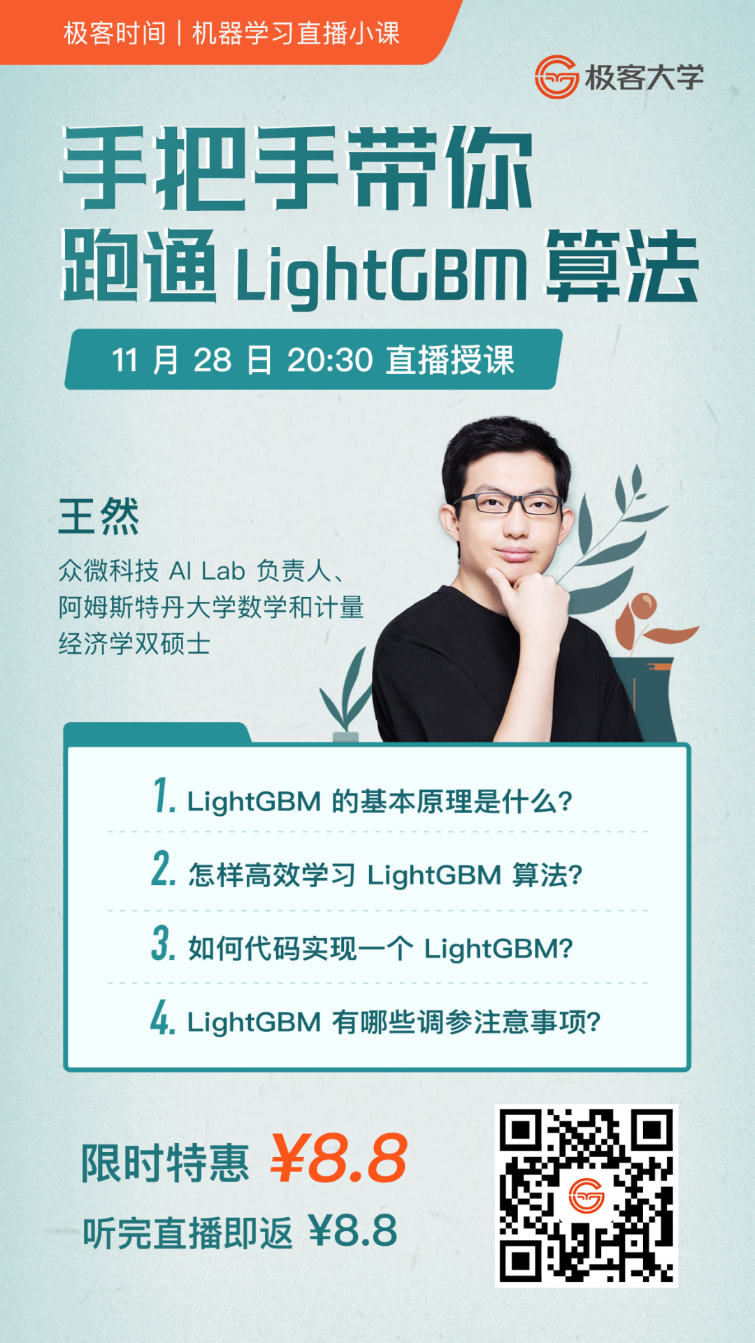 众微科技 AI Lab 负责人、阿姆斯特丹大学数学和计量经济学双硕士--王然,将用 2 个小时,手把手带你跑通 LightGBM 算法。