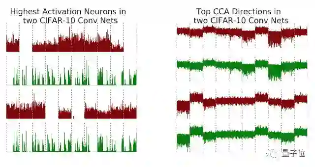 比如说,我们在中型图像分类数据集CIFAR-10上训练两个卷积神经网络net1和net2,然后为了将这种方法的结果可视化,我们将神经元的激活向量与SVCCA的对齐特征输出进行比较。回想一下,一个神经元的激活向量是基于输入图像的原始标量输出。