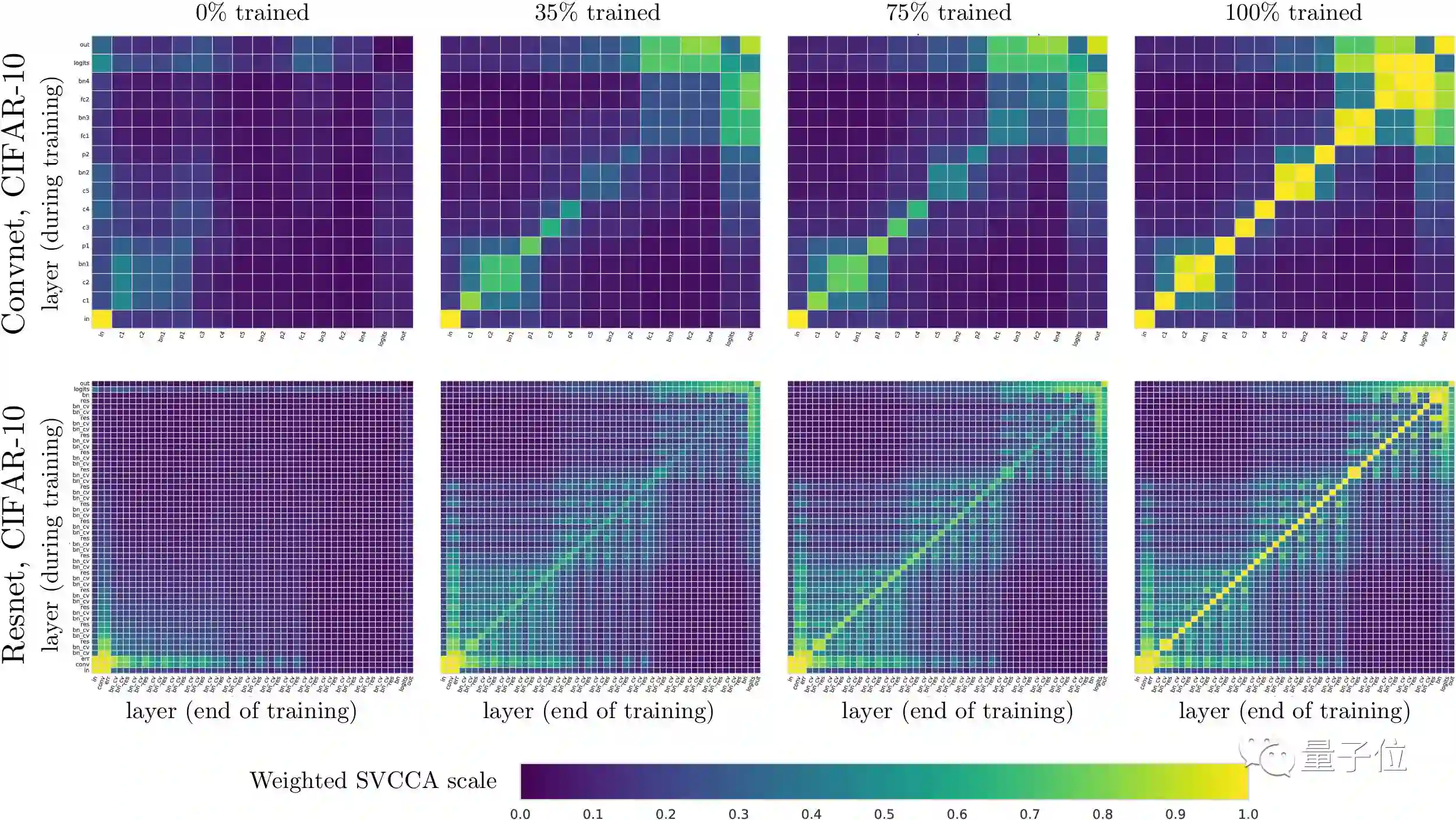 在左上角“0% trained”图中,横轴表示训练完成时net1层增加的深度,纵轴表示0%训练时增加的深度,每个小方块(i,j)表示100%训练的i层和0%训练的j层的表示,有多大的相似度。其中左下角的小方格是输入层,在0%和100%训练时表示完全相同,正和我们预期一致。