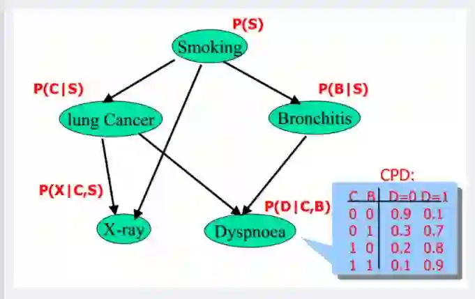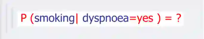 ▶ smoking表示吸烟,其概率用P(S)表示,lung Cancer表示的肺癌,一个人在吸烟的情况下得肺癌的概率用P(C|S)表示,X-ray表示需要照医学上的X光,肺癌可能会导致需要照X光,吸烟也有可能会导致需要照X光(所以smoking也是X-ray的一个因),所以,因吸烟且得肺癌而需要照X光的概率用P(X|C,S)表示。