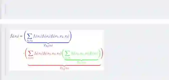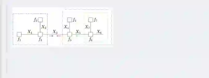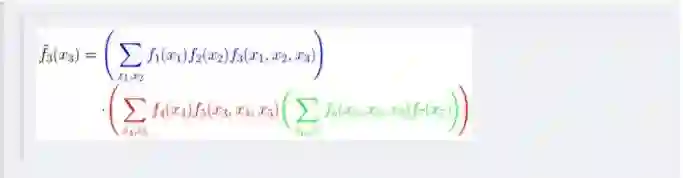 第一步、对于f 的分解图,根据蓝色虚线框、红色虚线框围住的两个box外面的消息传递: