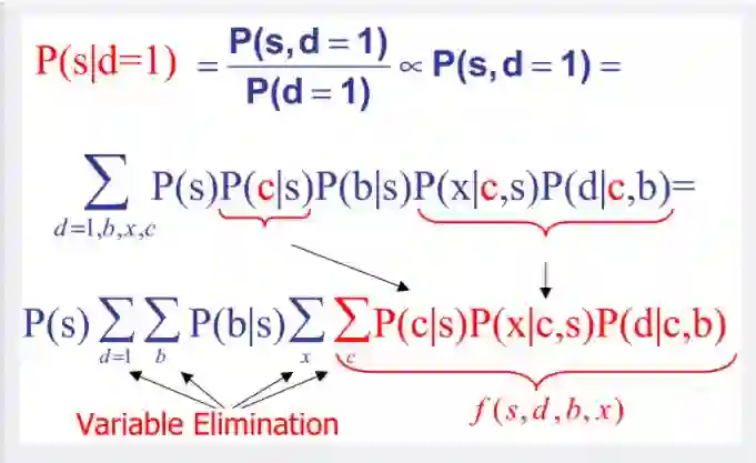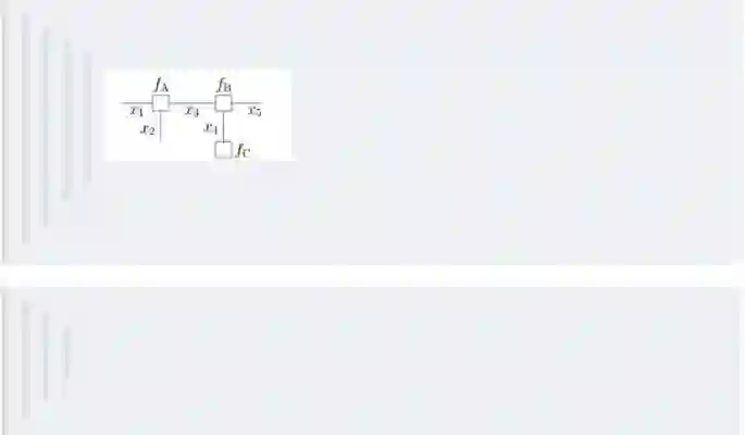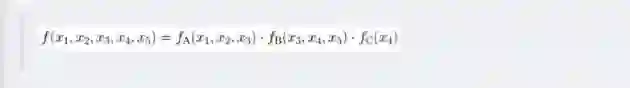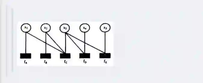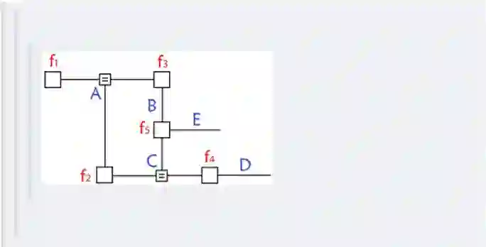 其中fA,fB,fC,fD,fE为各函数,表示变量之间的关系,可以是条件概率也可以是其他关系(如马尔可夫随机场Markov Random Fields中的势函数)。
