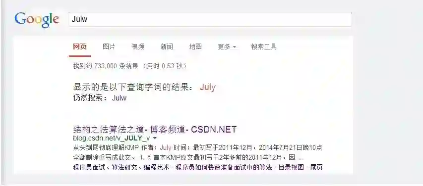 经常在网上搜索东西的朋友知道,当你不小心输入一个不存在的单词时,搜索引擎会提示你是不是要输入某一个正确的单词,比如当你在Google中输入“Julw”时,系统会猜测你的意图:是不是要搜索“July”,如下图所示: