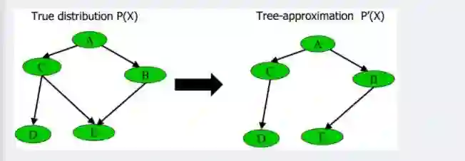 具体变换的过程为最大权生成树算法MSWT(详细建立过程请参阅此PPT 第60页),通过此算法,这课树的近似联合概率P'(x)和原贝叶斯网络的联合概率P(x)的相对熵(如果忘了什么叫相对熵,请参阅:最大熵模型中的数学推导)最小。