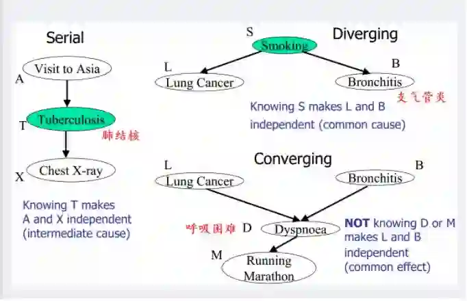上图中左边部分是head-to-tail,给定 T 时,A 和 X 独立;右边部分的右上角是tail-to-tail,给定S时,L和B独立;右边部分的右下角是head-to-head,未给定D时,L和B独立。