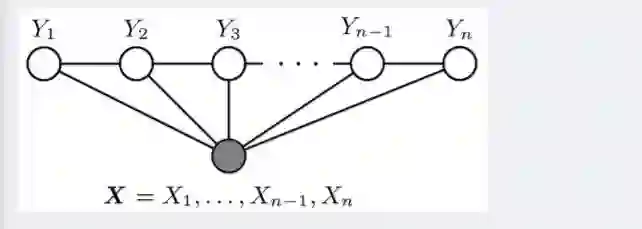 设X=(X1,X2…Xn)和Y=(Y1,Y2…Ym)都是联合随机变量,若随机变量Y构成一个无向图 G=(V,E)表示的马尔科夫随机场(MRF),则条件概率分布P(Y|X)称为条件随机场(Conditional Random Field, 简称CRF,后续新的博客中可能会阐述CRF)。如下图所示,便是一个线性链条件随机场的无向图模型:
