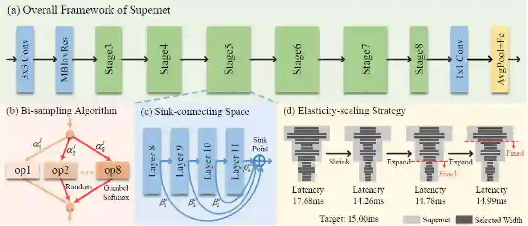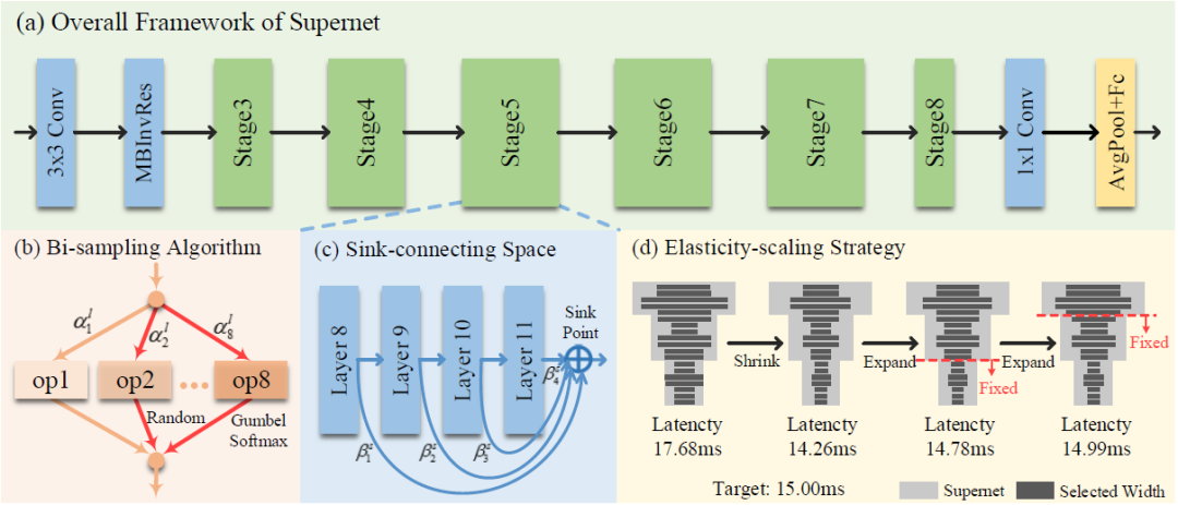 为了解决上述问题,该方法对当前主流的可微分网络架构搜索算法进行实验分析,从算子、深度和宽度三个维度出发,通过简单精妙的设计,分别提出了双路采样算法、汇点连接空间和弹性缩放策略,如图1所示。