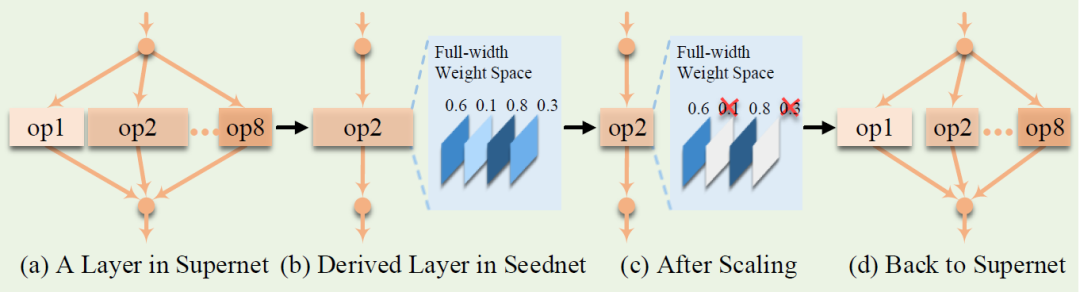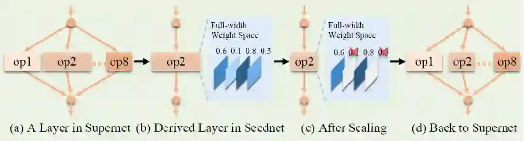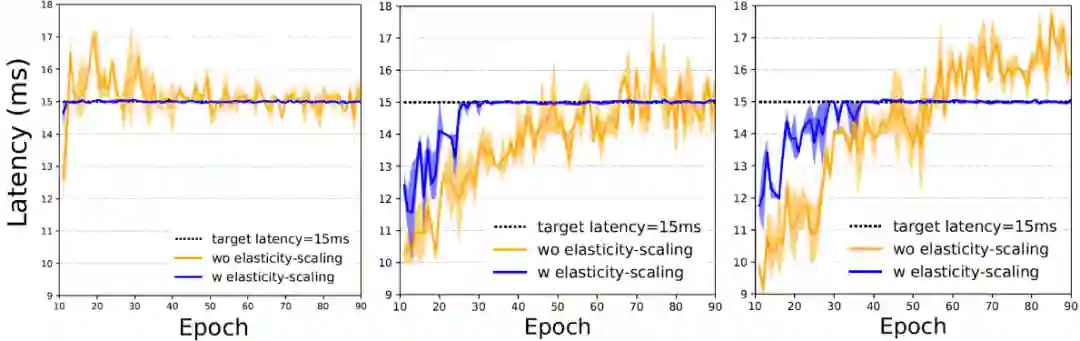 对于宽度层面的搜索,该方法发现由于宽度搜索空间粗粒度的离散性和无界的资源约束目标函数项,使得现有方法很难搜索到严格满足特定资源约束的网络架构(图4),并对资源约束目标函数项的超参数设置十分敏感。为了缓解这些问题,该方法提出了弹性缩放策略在搜索过程中动态自适应地调整超网络中每一搜索层中每一搜索算子的宽度,如图1(d)和图3。
