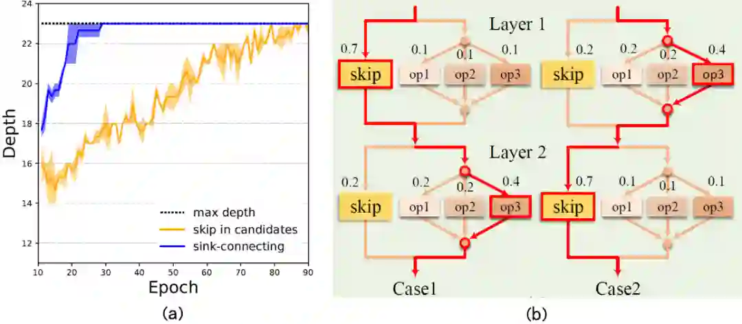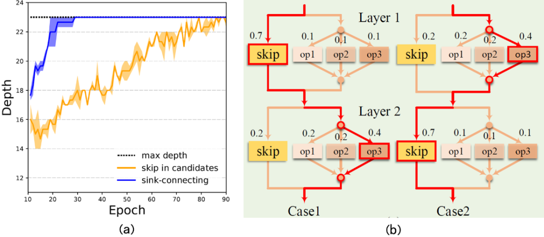 对于深度层面的搜索,现有算法通常直接将跨层(Skip)算子加入到待搜索候选算子集中。然而,由于跨层算子的非参数性以及与其他算子的互斥性,这种设计方式会导致网络深度的搜索不稳定,在整个搜索过程中有非常大的抖动,如图2(a)。此外,跨层算子的直接加入也会引起架构冗余现象发生,如图2(b)。为了解决这个问题,该方法设计了一个汇点连接搜索空间(图1(c)),将跨层算子的搜索剥离出来,增加深度搜索的稳定性,同时汇点连接的方式也巧妙地解决了架构冗余问题。
