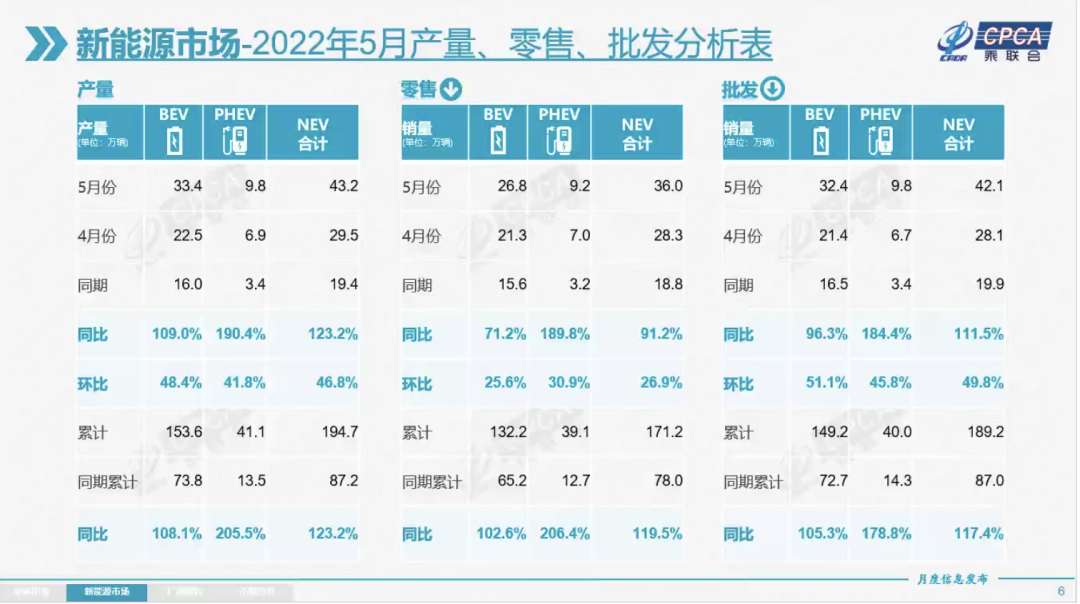 今年1月份,乘联会曾表示此前预期2022年新能源乘用车销量480万辆,应调整到550万辆以上,新能源乘用车渗透率达到25%左右。而截止5月份,全国新能源市场零售量171.2万辆,批发量189.2万辆。