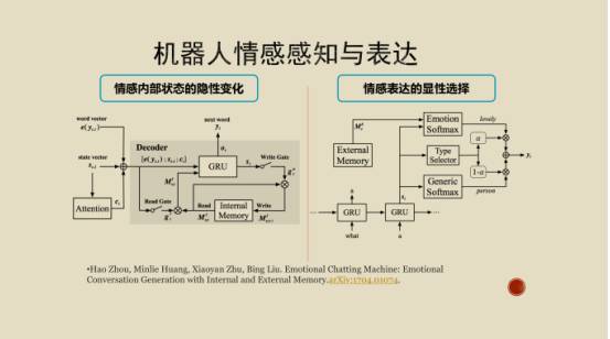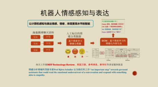 在情绪类感知和表达部分,我们研究了怎么样在语音语调上感知。比如你不高兴的时候你会怎么说话,你很开心时候怎么说话。另一方面通过你的面部表情,比如皱眉、或者开心的笑。我们做的是怎么样在文字上表达它的情感,是比前面要更加隐讳的一个表达方式。其中一个方法是从微博里面抓取微博互动的数据,利用标注数据训练一个情绪的分类器,这个情绪分类器会把数据标记为喜怒哀乐的类别,然后把这些数据送到深度学习生成模型里面。