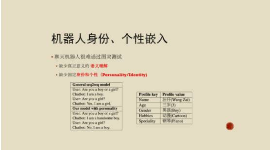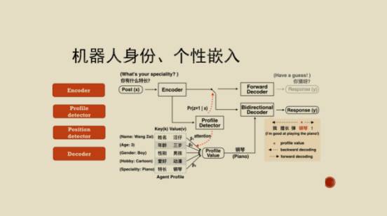 另外我们在机器人身份上、个性嵌入上做了工作。假设我们机器人确定一个身份,它就是一个三岁小男孩儿,喜欢动漫又能弹钢琴,这样的人设下能不能够生成一个很好的答复,跟他的身份一致的答复?这个问题很有挑战,你没有足够的数据去训练这样的模型。我们是用海量微博互动的数据。这种情况下你应该用人设的数据来回答问题,并且根据这个人设资料进行很好的答复生成。
