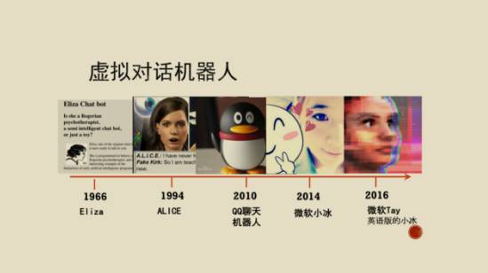 我们可以回顾一下虚拟的对话机器人,可以通过文字输入、输出,或者语音输入、输出的一个机器人,存在于网络世界而没有实体。从Eliza(做心理咨询的)到ALICE到QQ聊天机器人、小冰。还有很多实体机器人,比如说情感机器人Pepper,它是一个人形机器人,有一定的情感识别和表达能力,包括MIT的Jibo可以在家庭里执行一定任务,这些机器人可以进行一定的助理工作,同时还可以跟家庭成员进行一个有效的互动。