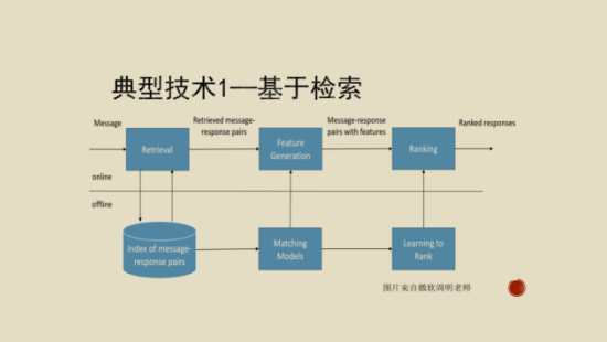 这是一个深度学习的模型,在微博上面训练出来的。当人们说话的时候,机器可以答复出来。它要真正做到深刻理解是非常困难的事情。另外,没有固定的身份和人格也是很大的问题。这里边有两类基本的技术,一个是基于检索的技术,需要一个很大的数据库,存储一些问题和答案。当新出现一个问题时,去这个库检索一个跟它最接近的问题,把那个问题的答案作为新问题答案的返回。
