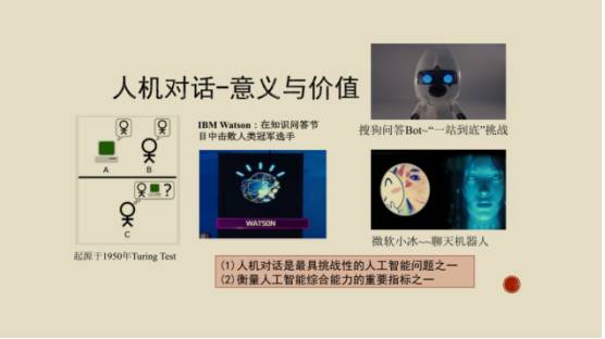 讲人机对话可以追溯到图灵测试。如果能通过图灵测试,就认为这个机器具备跟人一样的智能。IBM Watson知识问答的系统,在当时引起很大的轰动,后来其被用于各个行业。