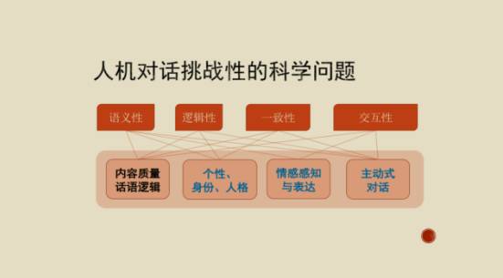 这样一些对话机器人真正进入到千家万户是一个非常难以解决的问题,具体体现在以下两个方面。第一,要真正理解它的语意很难。第二,它的逻辑非常重要。你对话的时候,有很多常识的问题、逻辑上的问题怎么样去解决?包括一致性的问题,交互性的问题,而你在交互过程中怎么能跟用户有很好的互动、情感的理解,也是研究里的一些重点。其中涉及到你怎么生成高质量的答复,我们前面演讲说判断一个文章是人还是机器写的,对话里也面临这个问题:怎么给它一个身份、个性、人格,包括怎么样去理解和表达情感,包括怎么样去主动跟机器进行对答,不仅仅是被动的应答。