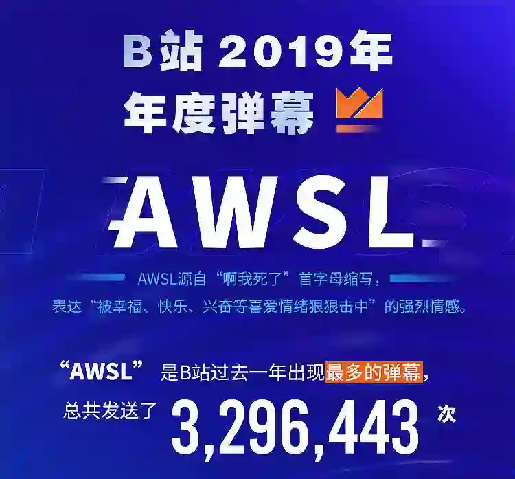 36氪获悉,B站发布2019年年度弹幕——“AWSL”,这也是B站第三年进行年度弹幕盘点。此外,“泪目”“名场面”“妙啊”“逮虾户”“欢迎回家”等弹幕也入选今年十大弹幕热词。在过去一年中,B站用户总共发送超14亿次弹幕,其中发送年度弹幕“AWSL”3296443次。