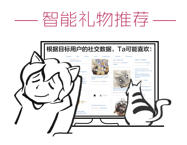 送礼物的是一件需要思考的问题,如何达到最佳效果,既有心意又有创意很难同时达到。但是计算机可以通过分析目标用户的社交网络数据,个人资料和兴趣来为你个性化推荐礼物,不再有挑选礼物的困扰。