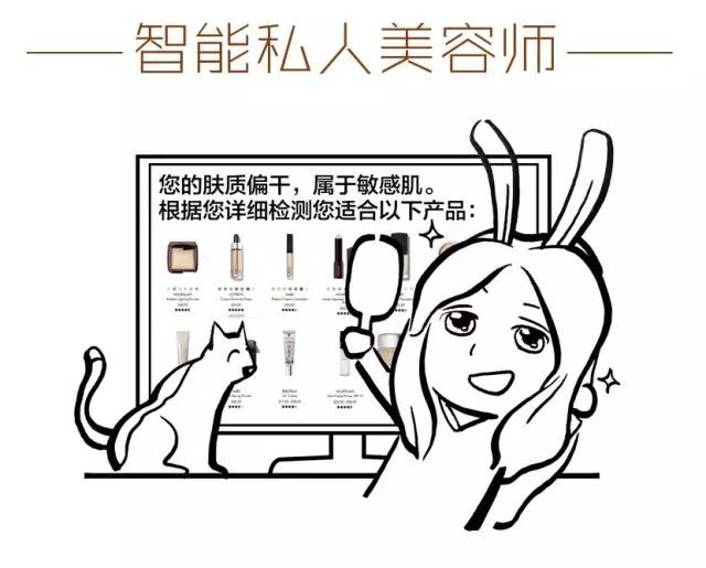 计算机根据搜集到的用户肤质数据,协同过滤市场上千款产品推荐最合适的给用户。从此不用去挑护肤品,不用去试妆;色号,粉底等会根据需求推荐给用户,再不担心买到不适合的产品。