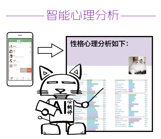 计算机心理分析师,性格分析师;计算机通过用户在社交媒体发布的文字,图片等分析个人性格和心理。综合数据得出结论后,对于个人未来成长和认知具有一定的参考价值。计算机分析的维度包含性格透明度,冒险精神,艺术兴趣,感动性,想像力,智力权威挑战,责任心,奋斗,谨慎,孝顺,条理,自律等四十多项目综合指标。用户不再需要做大量的问卷或者咨询医生,通过AI就可以解决问题。