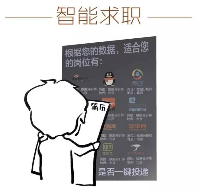 用户上传个人资料到平台,计算机通过自然语言处理和数据挖掘技术分析个人简历和社交网络并智能匹配合适的公司,而公司方也会相应匹配到合适的简历,过程更加公开透明有迹可循,免去高成低就,费时费力的烦恼。