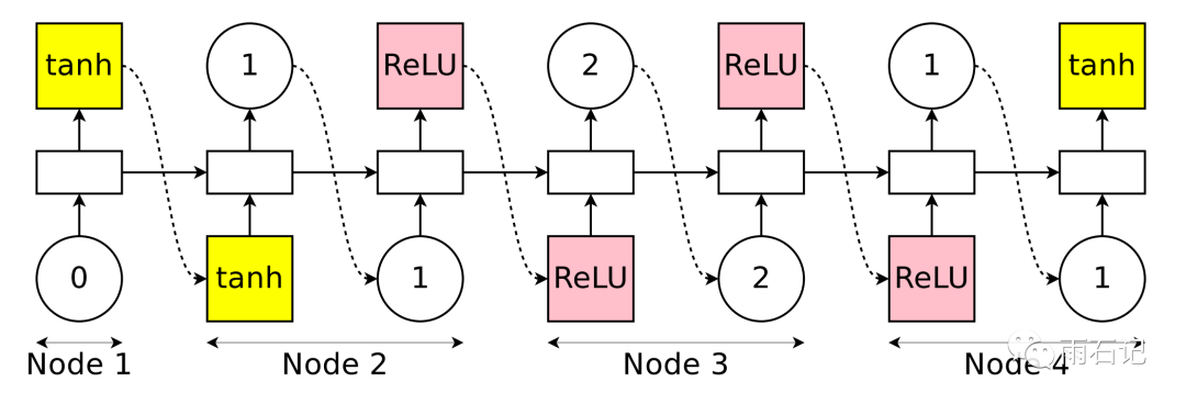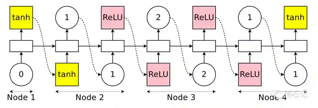这里,假设搜索空间中有N个节点,且每个节点可以是四种操作。那么,搜索空间将会有4^N x N!中网络,如果N=12,那么搜索空间大小则为10^15个。