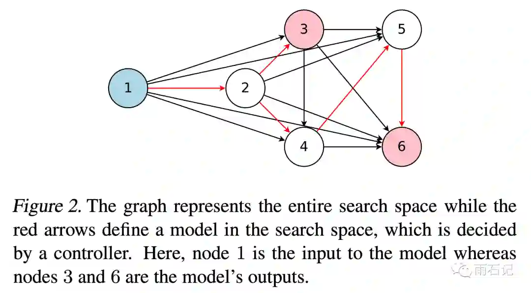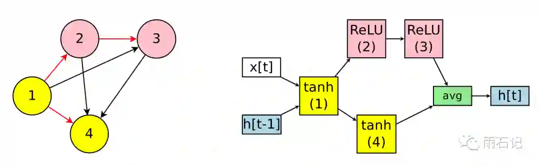 在图中,红线表示网络结构。红线和黑线全部表示的则是整个搜索空间。在红线表示的结构单元中。x[t]和h[t-1]输入给节点1,节点1输入给节点2,节点2输入给节点3,节点1还输入给节点4,节点4和节点3的输出聚合得到了最后的输出。
