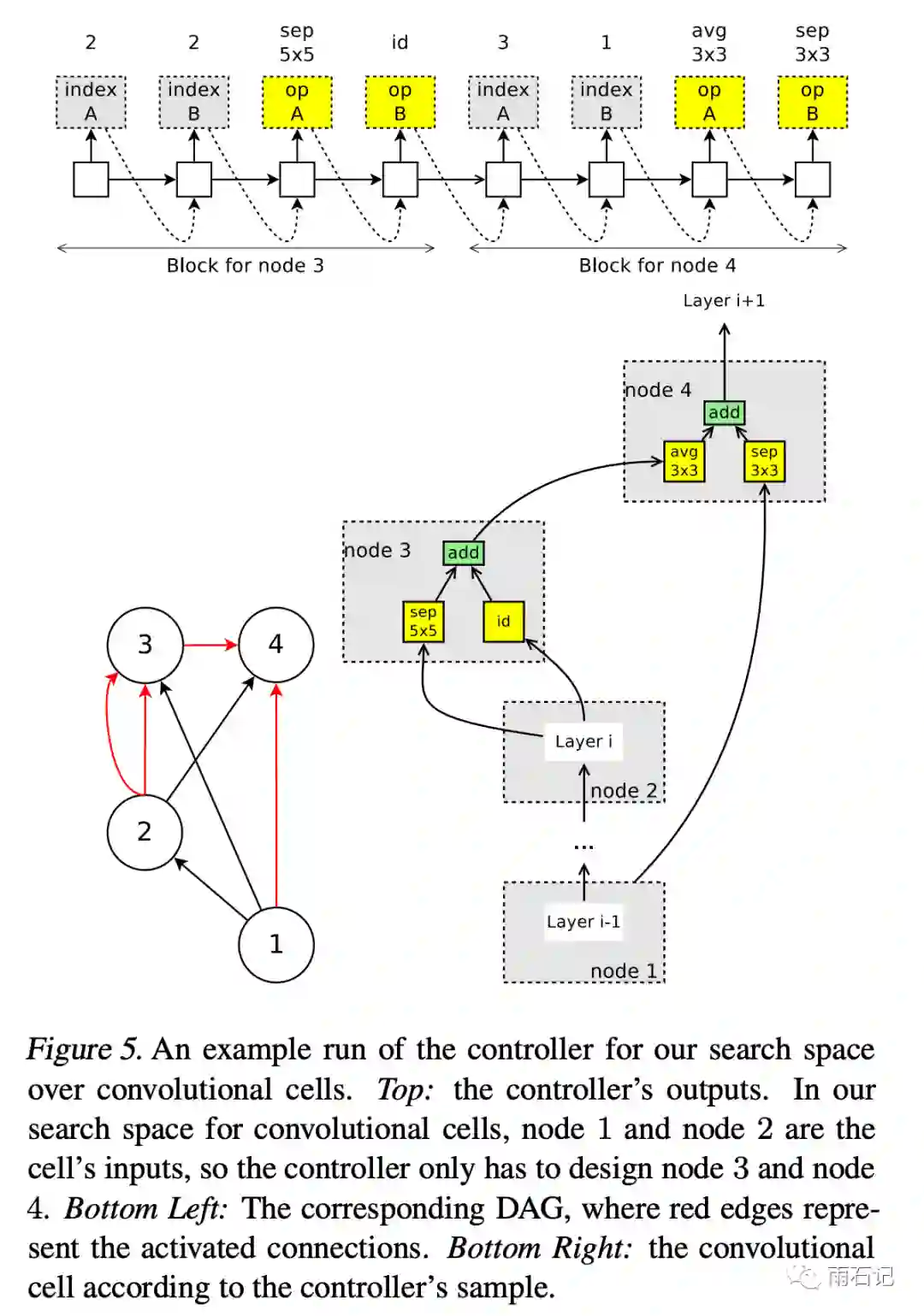 而这个网络结构在controller上的输入输出则如下图,第一步是直接用上一步的隐含状态h[t-1]和x[t],只需要选择操作就可以了。而后面的每个节点都有两个阶段组成,第一步是选择输入,第二步则是选择操作。