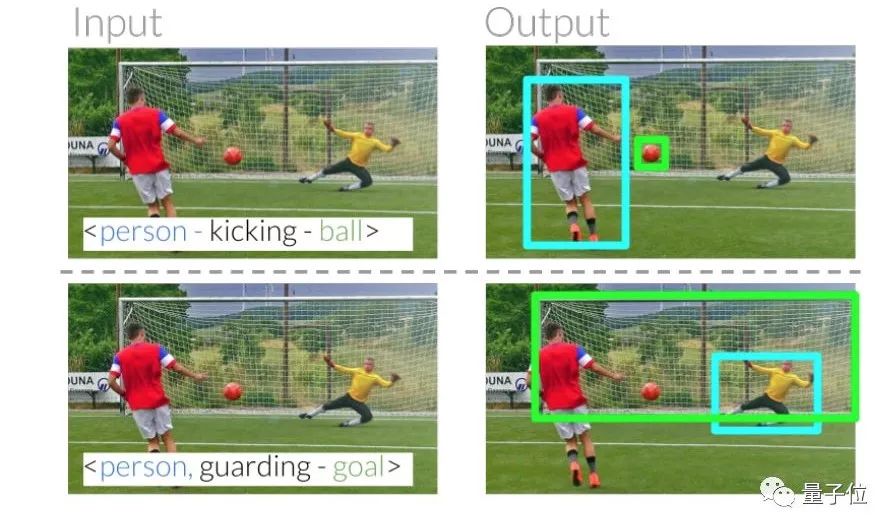 不过,不是所有的主体和客体都那么容易找出来,比如说人很好识别,但球门就不一定了。几位研究员所用的方法,是先找到主客体之间的关系,这样只要定位出其中一个,就很容易找到另一个。