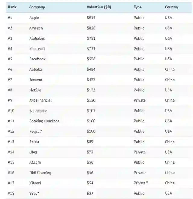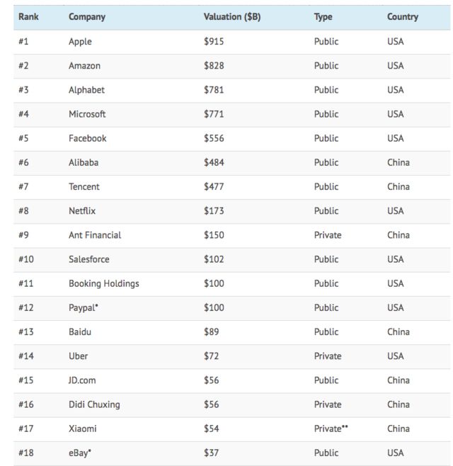 “互联网女皇”玛丽•米克(Mary Meeker)著名的《2018年互联网趋势报告》的最新版本着重列出了按估值排名的全球顶级互联网公司,有一个值得关注但可能意外的结果。