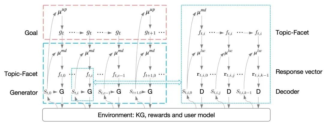 KnowHRL是一个基于知识的三层强化学习模型。具体来说,对于第一个子任务,上层策略学习遍历知识图(KG),以规划显式目标序列,从而在对话一致性、主题一致性与用户兴趣之间取得良好平衡。对于第二个子任务,中间层策略和下层策略协同工作,借助目标完成机制,围绕给定话题的同用户进行深入聊天。